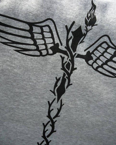 На шее, прямо под затылком — крылатый крест, увитый шипастым растением, вниз по позвоночнику спускаются два стебля этого растения с колючками, перевитые спиралью, похожей на цепь.