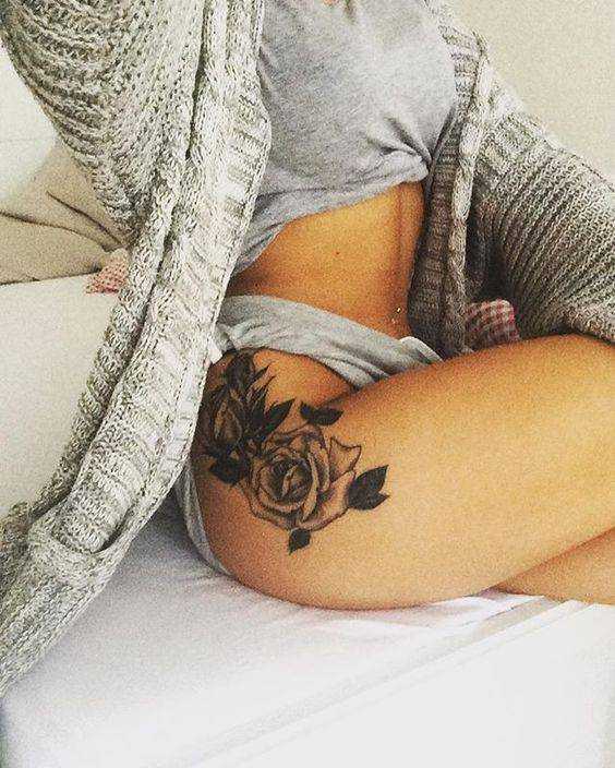 Не менее распространена татуировка розы на бедре – значение этого рисунка восходит к страсти и дерзости, придаёт женщине поистине роковой, но в то же время нежный облик.