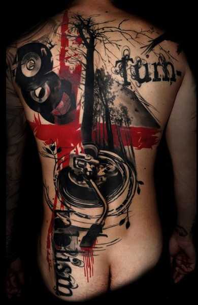 Trash с английского переводится как «мусор», полька – это веселый танец. Слияние двух разных понятий дает концептуальный стиль. Рисунки наслаиваются один на другой, что дает эффект многоплановости. Каждый, кто возьмет труд рассматривать и объяснять смысловую нагрузку такой тату, увидит в ней свое значение и даст свою трактовку. Сочетается несочетаемое (и тут уместно вспомнить литературный прием под названием оксюморон).