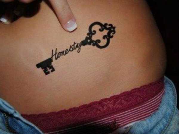 - Ключ с надписью (“Honesty”, “Love”, “Truth” и др.). Подобная татуировка указывает на то, что ценит человек больше всего, какие черты характера привлекают его в других людях.