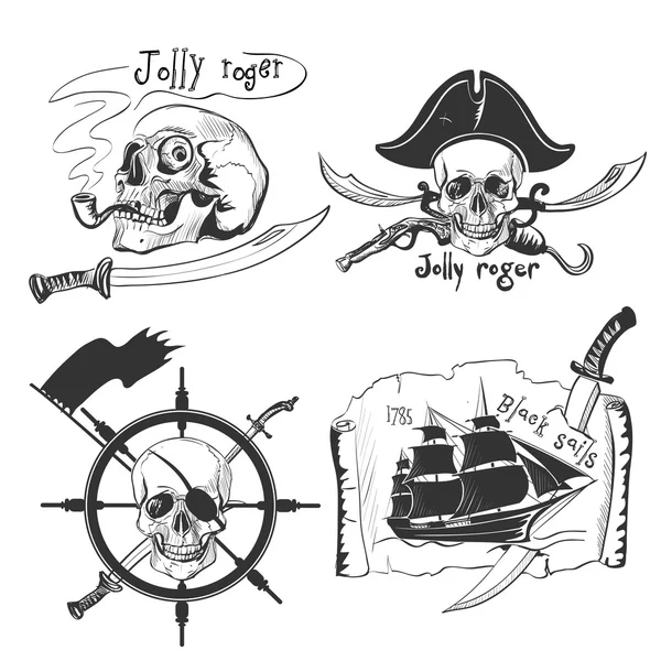 Одним из популярных пиратских татуировок является пиратский череп. Это изображение злого, гримасничающего (или смеющегося) черепа, украшающего бандану и пиратскую шляпу. Иногда внутри челюстей черепа изображена сабля или пистолет. Некоторым людям нравится добавлять к нему другие элементы, такие как пламя, корабельное колесо, якорь, компасы или сундуки с сокровищами.
