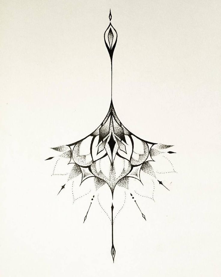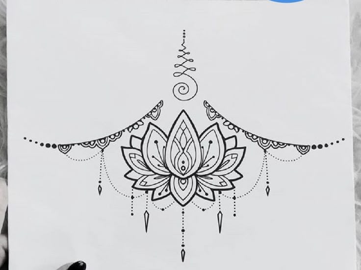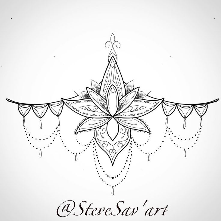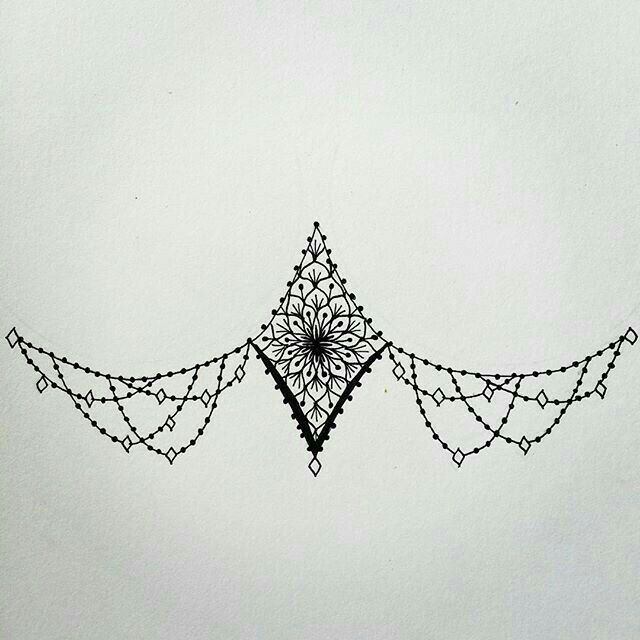 На данном изображении мы видим красивый детальный орнамент, созданный художником. Дизайн безупречен и визуально привлекателен. Это очень тонкая татуировка, которую наносят чуть ниже области груди. Такие дизайны не все трудоемки и выглядят более женственно и эффектно.