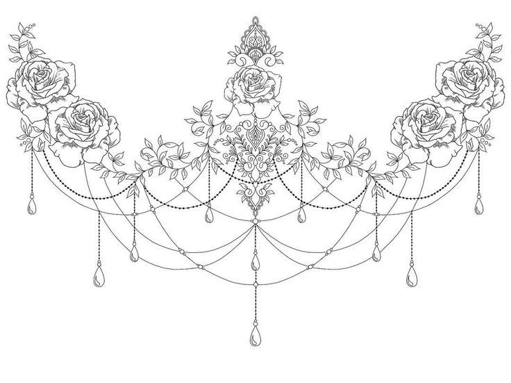 Рисунок находится в центре, под двумя грудями. Прелесть таких изображений в том, что узоры листьев и другие узоры дополняют кружево. Татуировка выполнена черным оттенком.
