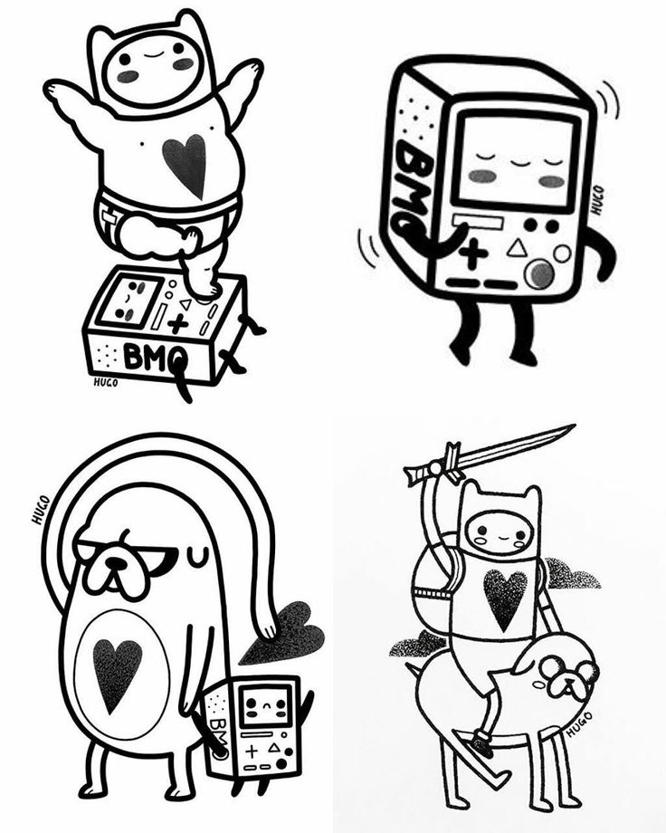 «Время приключений» — довольно известный анимационный фильм, адаптированный фанатами для тату. Основной сюжет построен на путешествиях мальчика Финна и его друга, бульдога Джека. Этот мультипликационный сериал стал очень популярным среди не только детей, но и взрослых.
