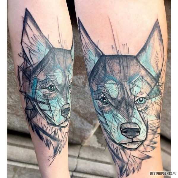 Девушки часто выбирают эскизы хаски выполненные в стиле акварель. Тату в данном стиле смотрится красочно, привлекает к себе внимание прохожих. Выглядит такая татуировка будто ее изобразили при помощи акварельных красок, что и является особенностью вышеупомянутого стиля.