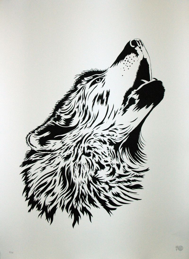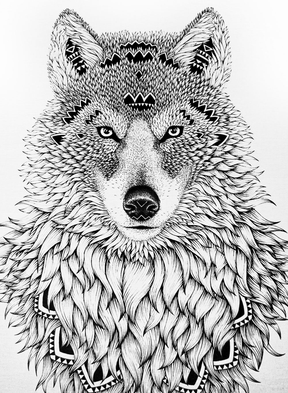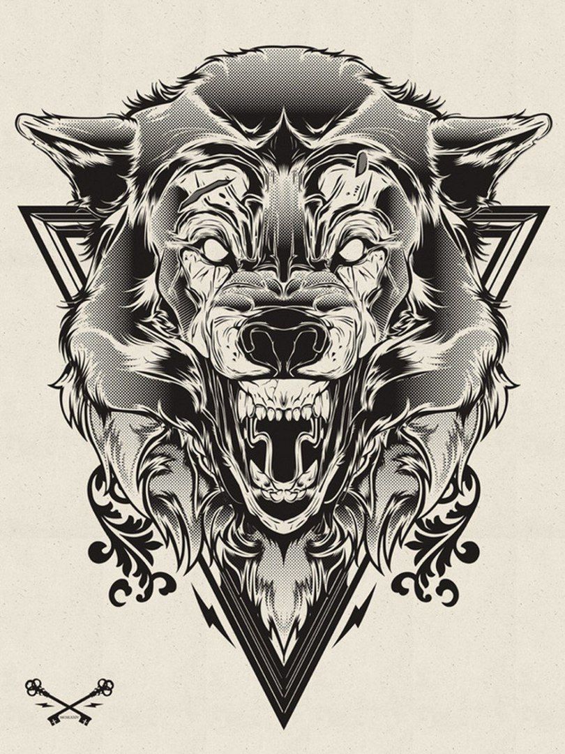 Всего 3 варианта применения стиля: волк состоит из линий, линии окружают хищника как орнамент и волка используют вместо фона для закраса линий.