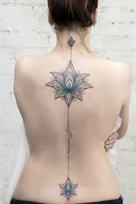 Чтобы привлечь большую удачу и положительную энергию девушки наносят на спину татуировку танцующего бога Шивы, богини Сарасвати или цветок лотоса. Индийские орнаменты восхитительны на пояснице и впечатляют своей яркостью и мелкими деталями.