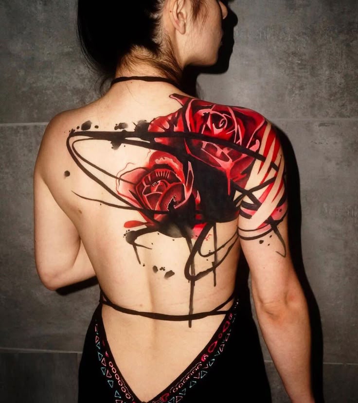 Эта татуировка особенно привлекла нас, поскольку она творческая, изобретательная и полностью покрывает верхнюю часть спины.