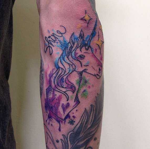 Эскизы в технике акварель отличаются легкостью, воздушностью, плавностью линий. Они больше подойдут утонченным девушкам. Лошадь с крыльями, устремившаяся в небо – один из любимых сюжетов женских тату. Тату будет эффектно смотреться на руке или на спине.