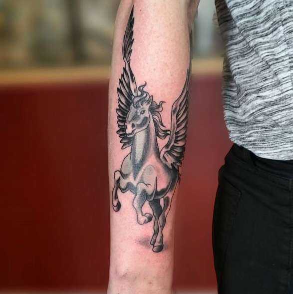 Что означает татуировка с лошадью? У древних греков одним из самых излюбленных животных был чудесный крылатый конь Пегас. Встречаются кони в колесницах Феба, Посейдона и в изображениях полулюдей-полулошадей кентавров, сочетающих в себе мудрость и боевой дух. Троянский конь вошел в историю как символ предательства и хитрости.