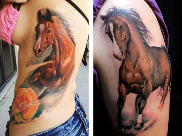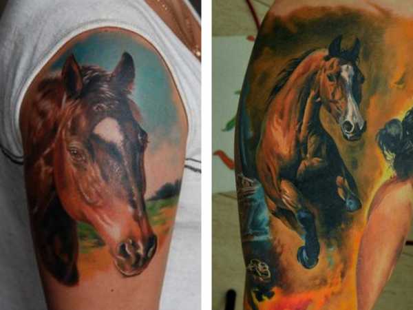 Изображение в стиле реализм будет смотреться очень красиво и натурально. Порой рисунки тяжело отличить от настоящего фото из-за реалистичных деталей и естественных оттенков. Игра теней, четко прорисованные контуры, насыщенные цвета делают тату настоящим произведением искусства. Лошадь можно изобразить с всадником, ковбоем, воином или подобрать интересный рисунок с животными, запряженными в колесницу. Здесь все будет зависеть от вашей фантазии и мастерства татуировщика.