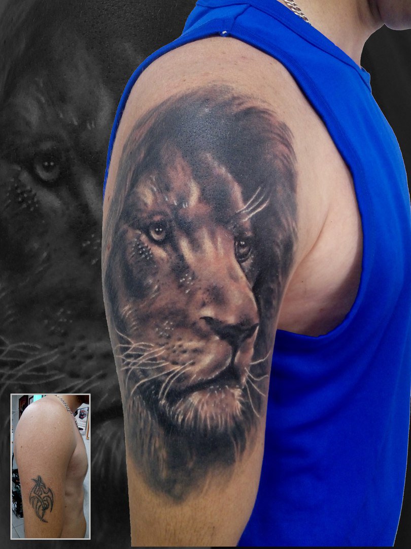 Мужчины чаще всего выбирают львов большого размера, поэтому и части тела под него выбираются соответственно: спина, грудь, плечо или рука целиком. Львы часто участвуют в качестве элемента длинных мужских рукавов. Мускулистое плечо отлично подходит для реалистичного изображения головы хищника – хорошо выполненная работа обещает быть очень стильной и эффектной.