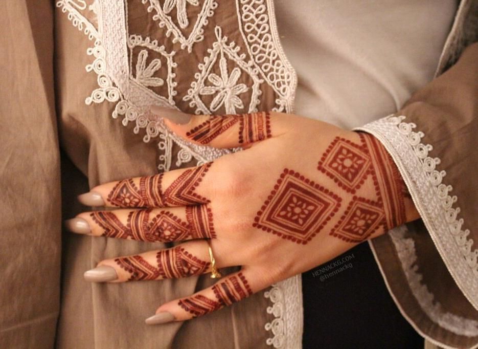 В Марокко свадебное торжество может длиться до пяти дней, и часть этого времени посвящена рисованию хной. Перед свадебной церемонией невеста собирается с подругами и родственницами, чтобы поесть и поговорить о супружеской жизни. Пожилые женщины делятся своей мудростью, чтобы помочь подготовить невесту к брачной ночи, пока ее руки и ноги украшают хной. Гости на свадьбе тоже красятся хной, но их рисунки обычно менее замысловаты, чем у невесты.