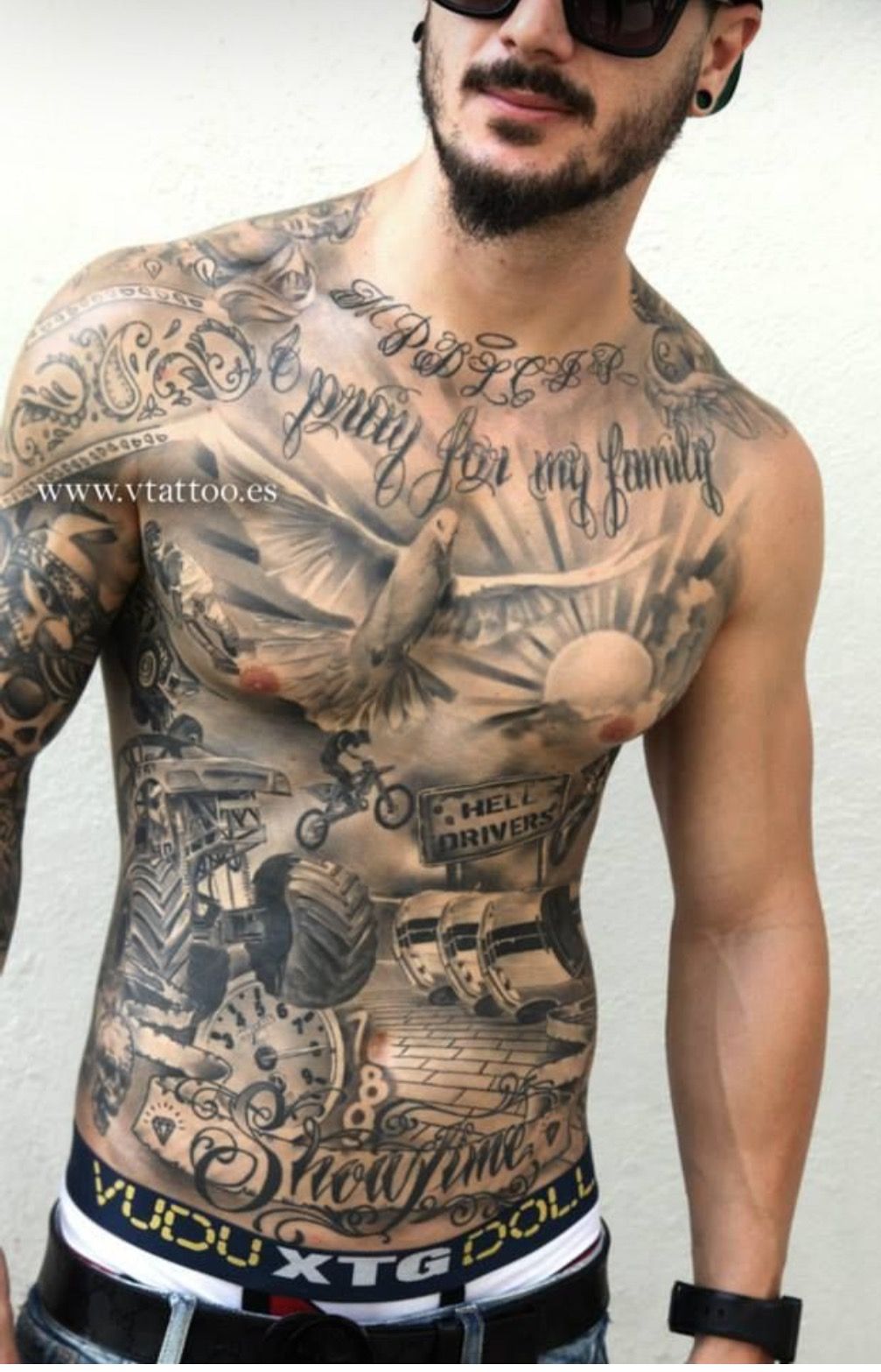 Мужские тату на груди выбирают любители крупных эскизов или символичных надписей. Рисунок, который располагается в области сердца с давних времен символизирует щит и оберег для своего обладателя. Татуировки на груди большую часть времени скрыты от глаз людей, но в то же время крупная татуировка всегда вселяет уверенность в своего обладателя и является его личным талисманом. Мужские тату на груди выбор смелых мужчин.