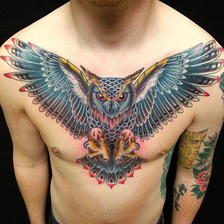 @seventhsontattoo через InstagramЭта полноразмерная татуировка совы на груди с эксклюзивным акцентом на распростертых крыльях птицы, окрашенная в оттенки огненно-коричневого, синего, оранжевого и красного, представляет собой новое определение стиля.