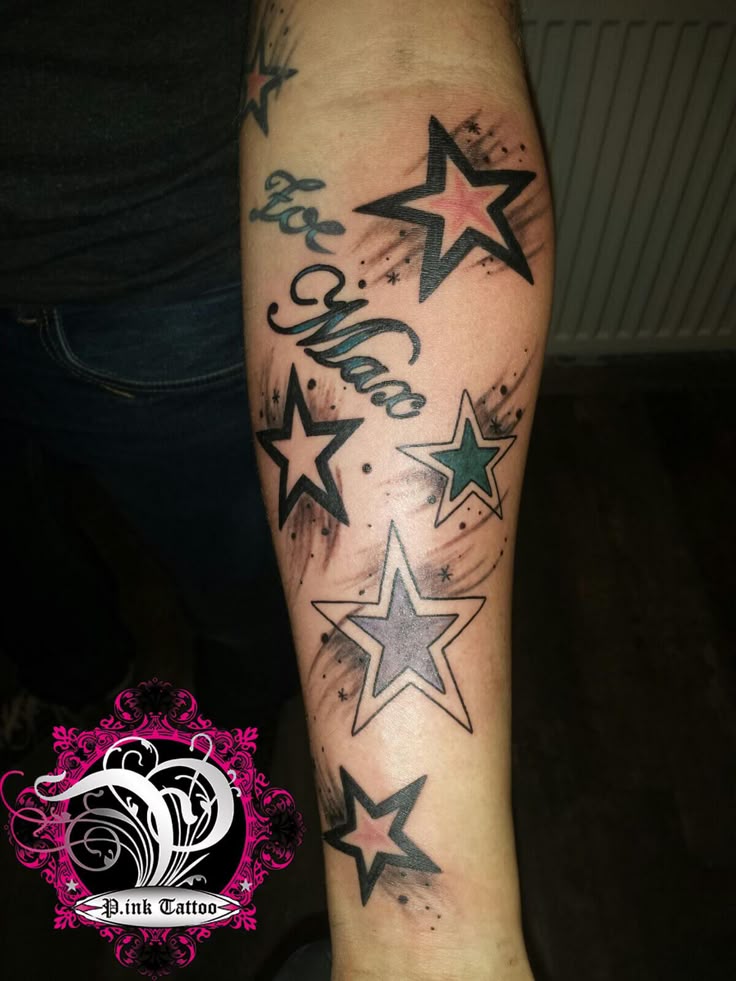 При выборе цвета чернил для любой татуировки в виде звезды нам нужно обратить внимание на типы рисунков, перечисленных выше: Морская звезда, Племенная звезда, Падающая звезда. Цветок и звезды, падающие звезды, три звезды, звездные знаки и множественные звезды. Морские татуировки можно увидеть практически в любом цвете, но они должны иметь как минимум другой оттенок для глубины. Дизайн татуировки падающей звезды не обязательно нуждается в цвете, но он потрясающий. Цветок и звезды отлично смотрятся в цвете.
