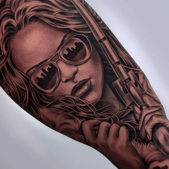 Эскиз в виде девушки с пистолетом в руке говорит о готовности обладательницы обороняться.