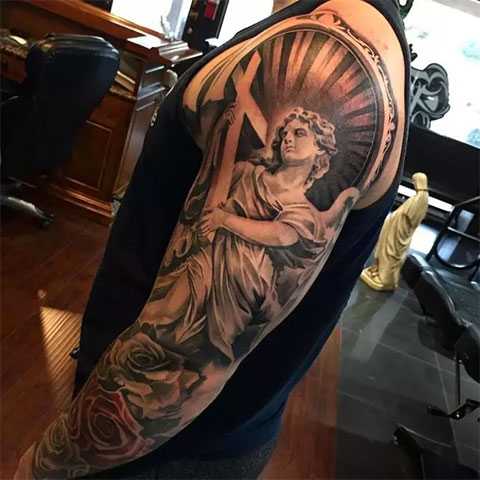 Татуировка с ангельской тематикой на руке мужчины