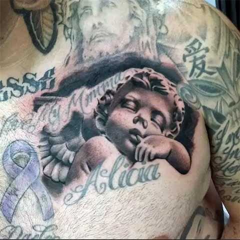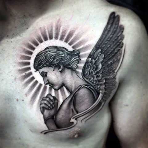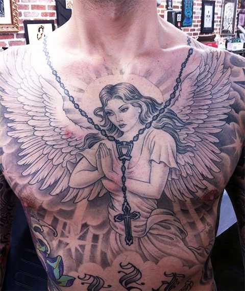 Татуировка с ангелом хранителем на груди у мужчины