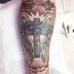 Крест с колючей проволокой и ангелами на предплечье