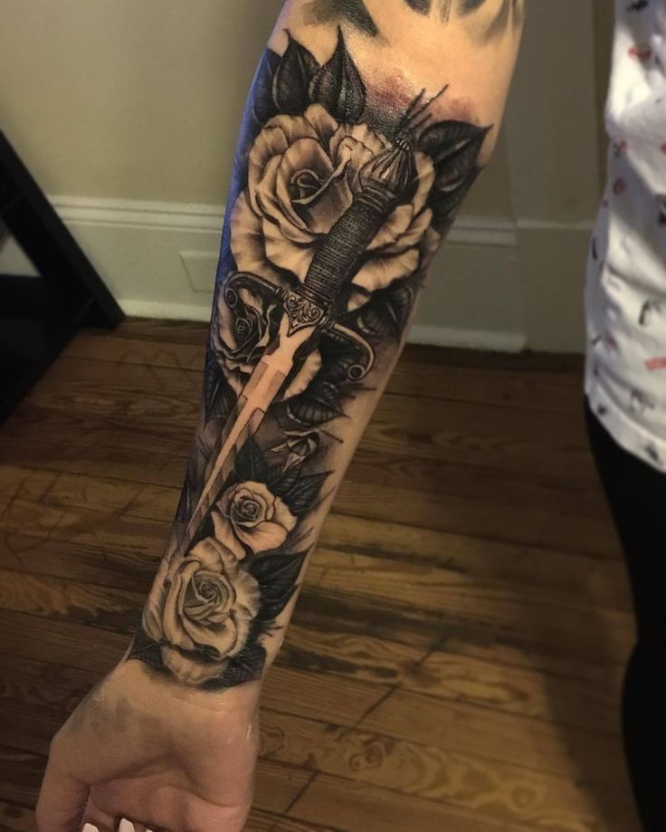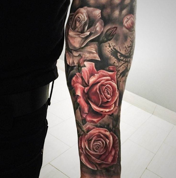 Красная роза считается символом вечной любви и красоты. Для джентльмена носить розы на предплечье означает, что это его символ равновесия. В этом творении красный отмечен как выбранный цвет для пары роз, что может означать страстную любовь к женщине или женщинам, которые ему дороги в его сердце.![]()