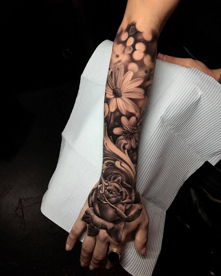 Неземная черно-серая цветочная татуировка на предплечье невероятно красива и, должно быть, на ее создание ушло довольно много времени. Контраст и четкость этой иллюстрации были смягчены, чтобы придать цветам нежную индивидуальность.