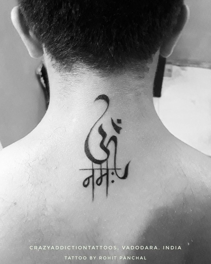 Найдите утверждение, которое вы глубоко чувствуете, и используйте его для своей татуировки. Этот покрывает всю заднюю часть шеи.