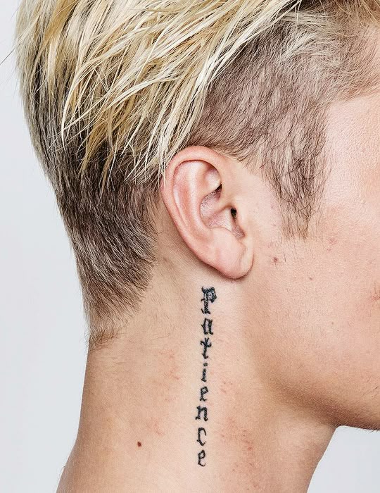 Одними из самых популярных татуировок на женской шее являются цитаты, имена или надписи. Они почти всегда центрированы, но могут быть размещены в любом направлении или выравнивании. Также выглядит очень красиво смещенным от центра к линии роста волос, следуя за волосами от уха. Лучший стиль шрифта здесь — шрифт от тонкого до среднего. Жирный шрифт может быть слишком тяжелым для некоторых людей, которым нужен элегантный чистый вид.