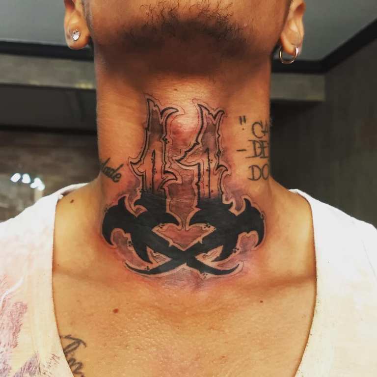 На шее имеется татуировка, изображающая пули, парящие в облаках дыма.