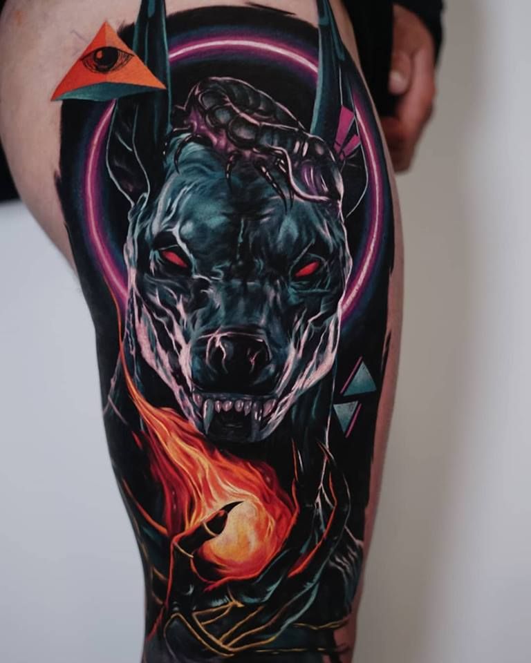 58. Я не уверен, дьявол он или просто демон, но эта татуировка полна огня и немного пугает. Если вы ищете страшную татуировку, то, возможно, это то, что вам нужно. хотя он огромный, поэтому я бы оставил его цветным, чтобы немного разбить его. так много черного может быть немного ошеломляющим.