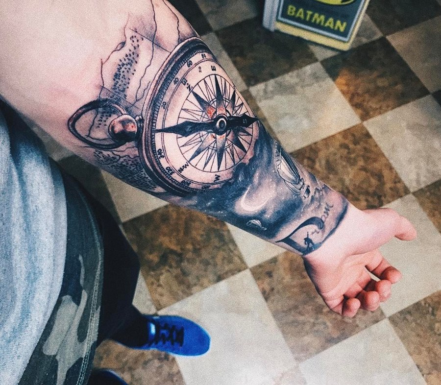 Татуировка с компасом олицетворяет силу характера: человек движется к цели так же, как стрелка компаса указывает на север.