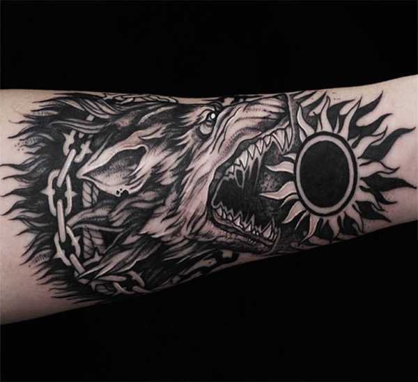 Π’Π°ΡΡΠΈΡΠΎΠ²ΠΊΠ° “Π²ΠΎΠ»ΠΊ” Π½Π° Π³ΡΡΠ΄ΠΈ ΡΠ²ΠΈΠ΄Π΅ΡΠ΅Π»ΡΡΡΠ²ΠΎΠ²Π°Π»Π° ΠΎ ΠΌΡΠΆΠ΅ΡΡΠ²Π΅ ΠΈ Π²Π½ΡΡΡΠ΅Π½Π½Π΅ΠΉ ΡΠΈΠ»Π΅ ΡΠ΅Π»ΠΎΠ²Π΅ΠΊΠ°, ΡΠΊΠ°Π·ΡΠ²Π°Π»Π° Π½Π° Π΅Π³ΠΎ ΡΠΈΠ»ΡΠ½ΡΠ΅ ΡΡΠΎΡΠΎΠ½Ρ. ΠΠ΅ΠΊΠΎΡΠΎΡΡΠ΅ ΠΊΡΠ»ΡΡΡΡΡ ΠΏΡΠΈΠΏΠΈΡΡΠ²Π°ΡΡ ΡΠΈΠΌΠ²ΠΎΠ»Ρ Π²ΠΎΠ»ΠΊΠ° Π²ΠΎΠ·ΠΌΠΎΠΆΠ½ΠΎΡΡΡ Π΄Π°Π²Π°ΡΡ ΠΆΠΈΠ·Π½Ρ Π²Π΅Π»ΠΈΠΊΠΈΠΌ Π³Π΅ΡΠΎΡΠΌ ΠΈ Ρ Π°ΡΠΈΠ·ΠΌΠ°ΡΠΈΡΠ½ΡΠΌ Π»ΡΠ΄ΡΠΌ.