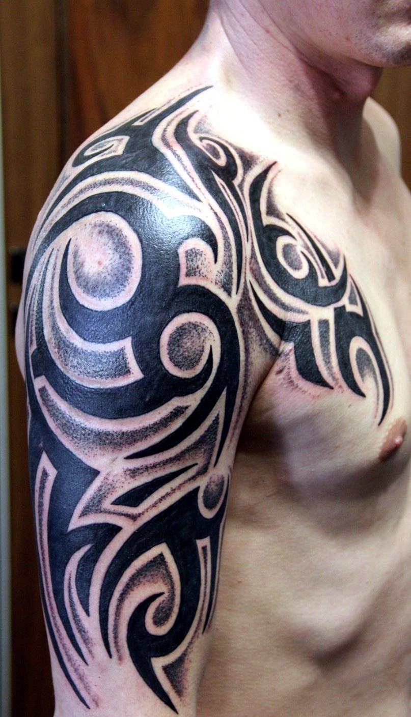 Стиль трайбл, впервые достигший мейнстрима в 90-х, по-прежнему популярен для татуировок. Толстые изогнутые линии идеально подходят для татуировки на плече, потому что они, кажется, «двигаются» вместе с вашим телом. Художник будет использовать ваши мышцы в качестве ориентира, определяя, где должны лежать линии рисунка, и формировать чернила в соответствии с ними. Конечный результат – яркая и мужская татуировка в стиле трайбл.
