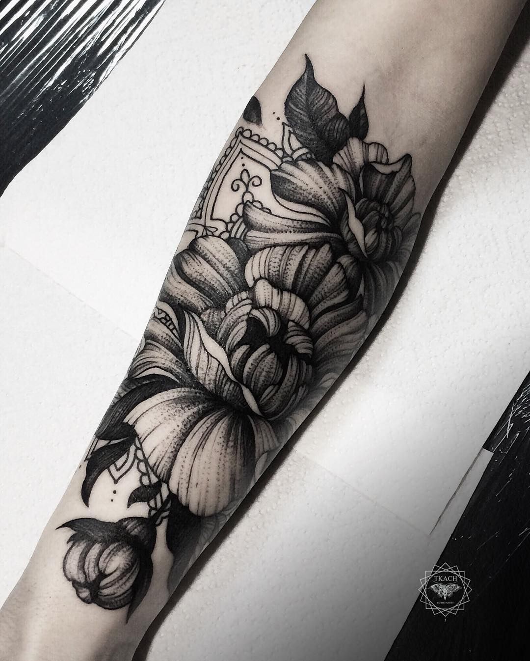 Не все женские татуировки должны быть очень женственными. Некоторые из них могут немного раздвинуть границы и проявить творческий подход. У этого есть интересная изюминка из-за смелых черных лепестков и множества серых деталей. Идеально подходит для плохих девочек.