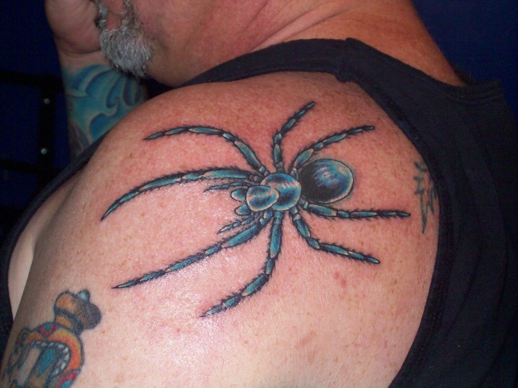 Тату с пауком неплохо смотрится на плече, спине, руках, животе.