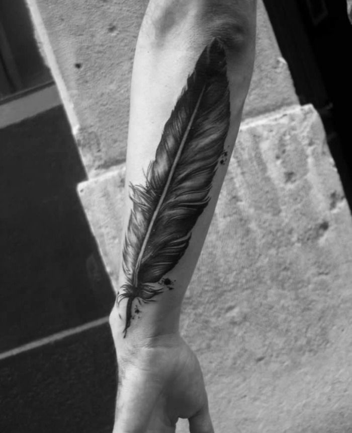 На левой руке этого молодого человека массивное орлиное перо. Коричневый и черный цвета блестяще используются для перехода от светлого цвета к более темному тону. Отличная татуировка с перьями, подходящая для мужских рук.