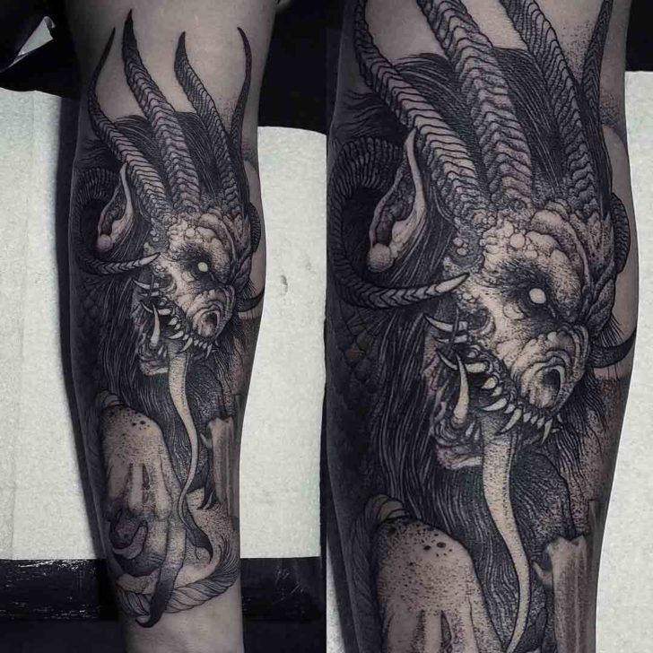Нередко среди популярных эскизов в демонической тематике можно встретить череп козла. Он часто ассоциируется со злом, хитростью, коварством и грехами.