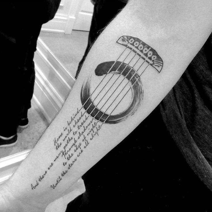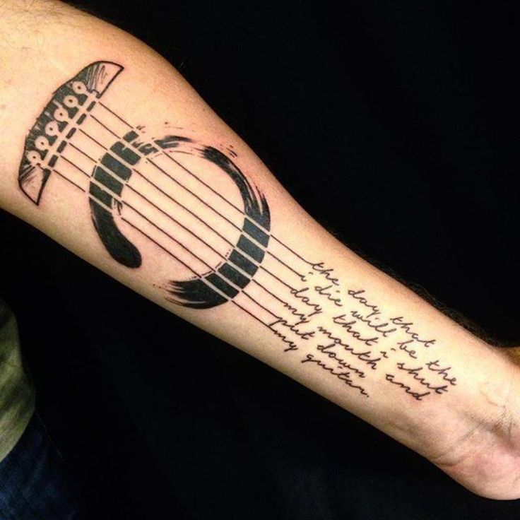 Несколько фраз из песни или известные строки из стихов важных постов начертаны вокруг инструмента для определенных людей. Многочисленные типы шрифтов, используемые для создания фантастического впечатления. Выглядит красиво, а фразы, которые вы выбираете, помогают прояснить смысл вашей татуировки. У вас есть возможность намотать полосу барной музыки вокруг вашего инструмента или просто разбросать вокруг нее символы и текст.