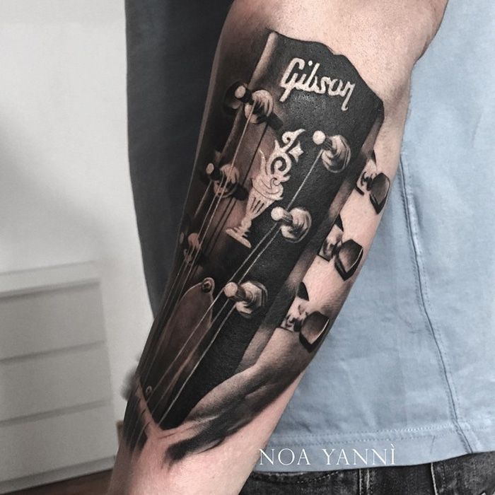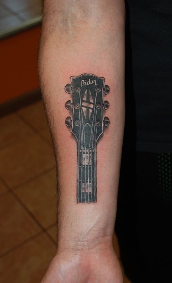 ИсточникЕсли у вас есть любимая гитара, татуировка головы грифа на предплечье может быть приятным штрихом. Этот конкретный экземпляр демонстрирует головку грифа Squier Stratocaster с реалистичным изображением и превосходным затенением.