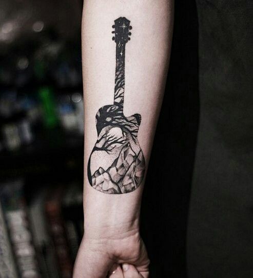 ИсточникОбучение игре на гитаре — это путешествие, и эта татуировка хорошо отражает это. Гитара стоит на вершине горы, излучая музыку на парящем свитке.