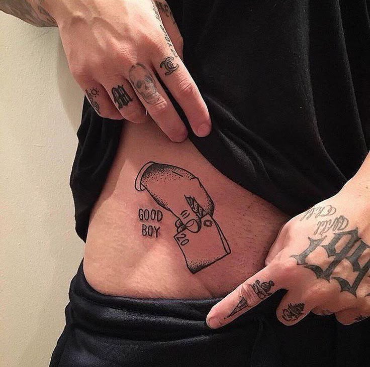 И снова, на животе частенько бьют татуировки женщины. Использовать в качестве элемента татуировки пупок — это не только клише, но и ничуть не смешное и отвратительное клише. Я понимаю женщин после кесарева, стремящихся скрыть шрам, а чуваков вроде этого — не понимаю.