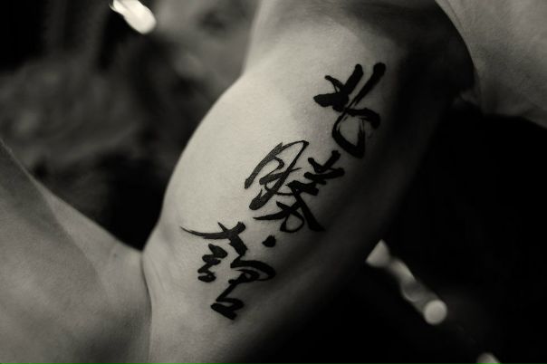 9.Как я уже сказал ранее, китайские шрифты можно стилизовать любым способом. Вот одна выложенная китайская татуировка на верхнем плече этого мальчика.