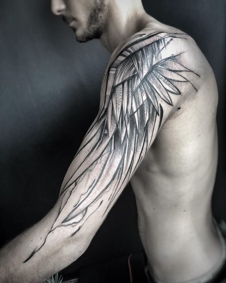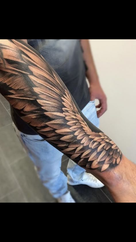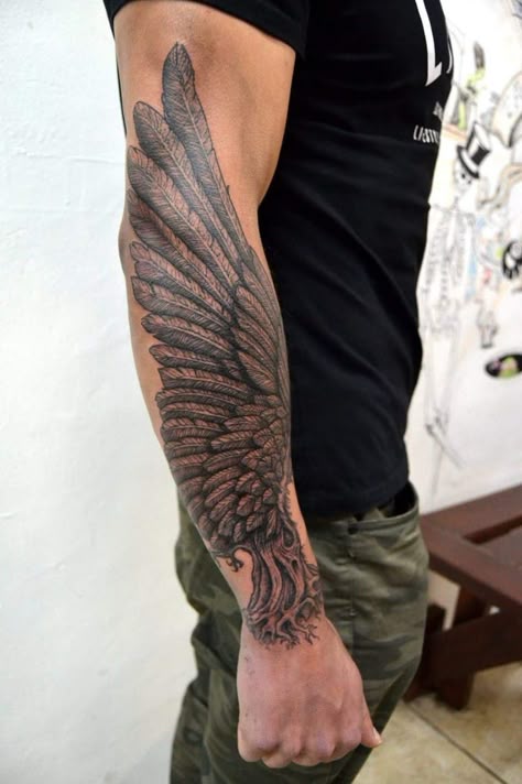 Татуировка крыла ангела с полным рукавомТатуировка крыла с полным рукавом покрывает всю руку. Вы должны нарисовать крыло очень большим и сложным. Кроме того, вы можете использовать разные цвета, чтобы придать ему подходящее представление. Татуировка также требует, чтобы художник был очень искусным.