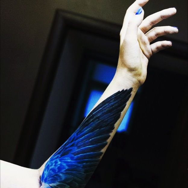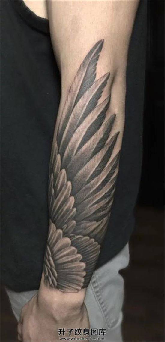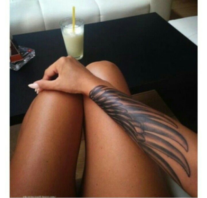 4. Татуировка крыльев от руки на предплечье. Это наше собственное оригинальное творение. Каждая прядь пера в этом крыле имеет разный рисунок и разный оттенок. Мы постарались придать этой татуировке уникальное трехмерное ощущение и в то же время сохранить свободный поток крыльев.