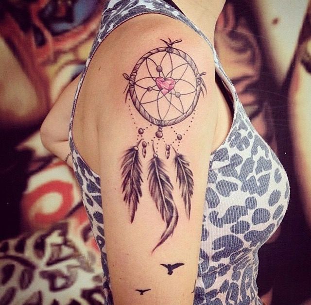 Девушка с татуировкой ловца снов на плече. Женщины часто делают татуировку ловца снов меньшего размера на плече, создавая элегантный образ. Плечо обеспечивает поддержку и пространство для того, чтобы дизайн был виден и более сфокусирован. Это потрясающий дизайн и размещение татуировки для женщин, и выглядит невероятно. Перья выделены, а инновационный дизайн выделяет татуировку.