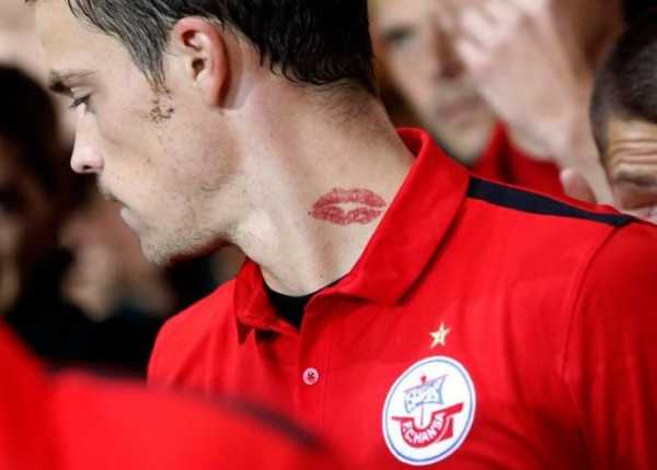 Аналогичную татуировку имеет футболист немецкого “Магдебурга” Деннис Эрдманн. Однако, его девушка целовала, видимо, только в шею.