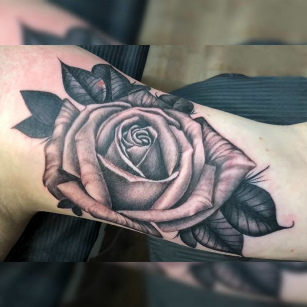 Татуировка с розой в оттенках серого
