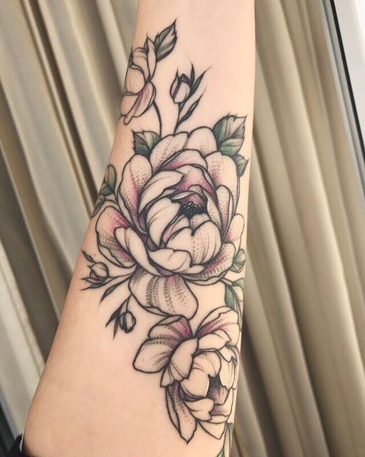 Для чёрно-белых эскизов чаще выбирают рисунки в стиле «випшейдинг», с композициями из роз или пионов. Цветные тату часто набивают в технике акварели, которая лучшим образом передаёт сочность оттенков и фактуру лепестков.