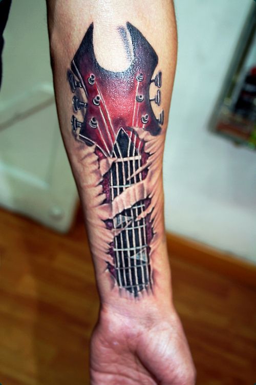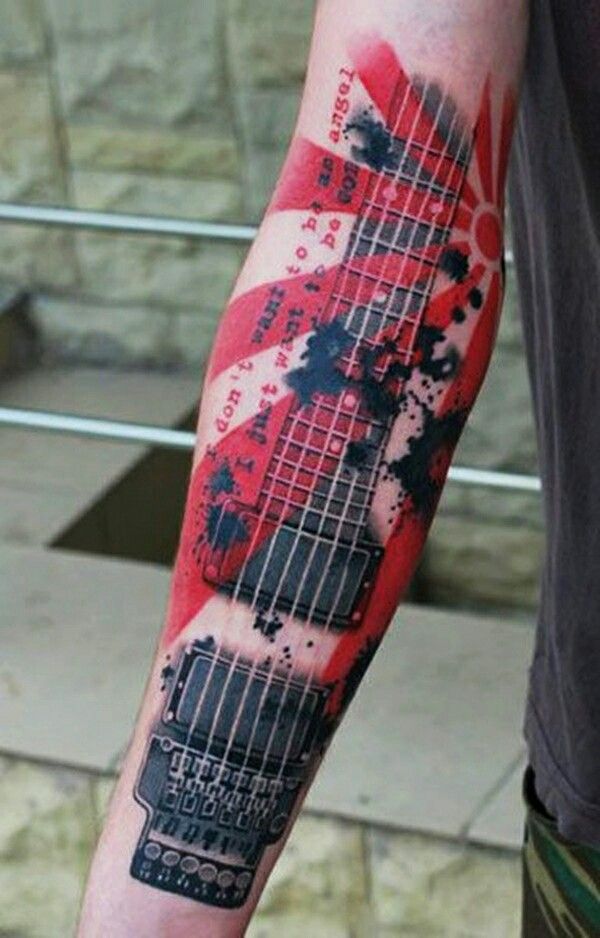 Татуировка на предплечье у парня – гитараТатуировка на предплечье у парня – гитара