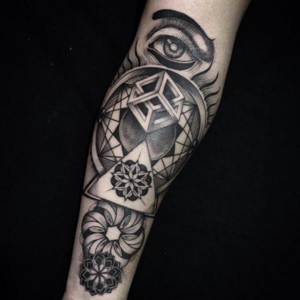 - Сама черная гамма дотворк-татуировки невольно ассоциирует с мрачными образами, а необычная геометрия стиля – с чем-то бесконечным и окутанным тайной. Поэтому до сих пор популярным является мнение, что данный стиль выбирают люди, желающие обрести внутреннюю гармонию в себе самом.